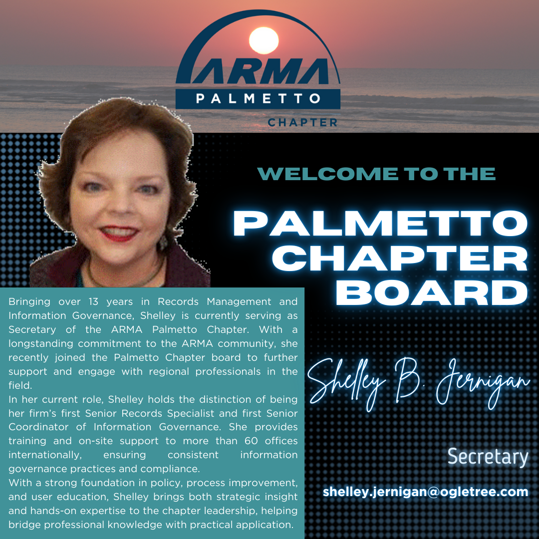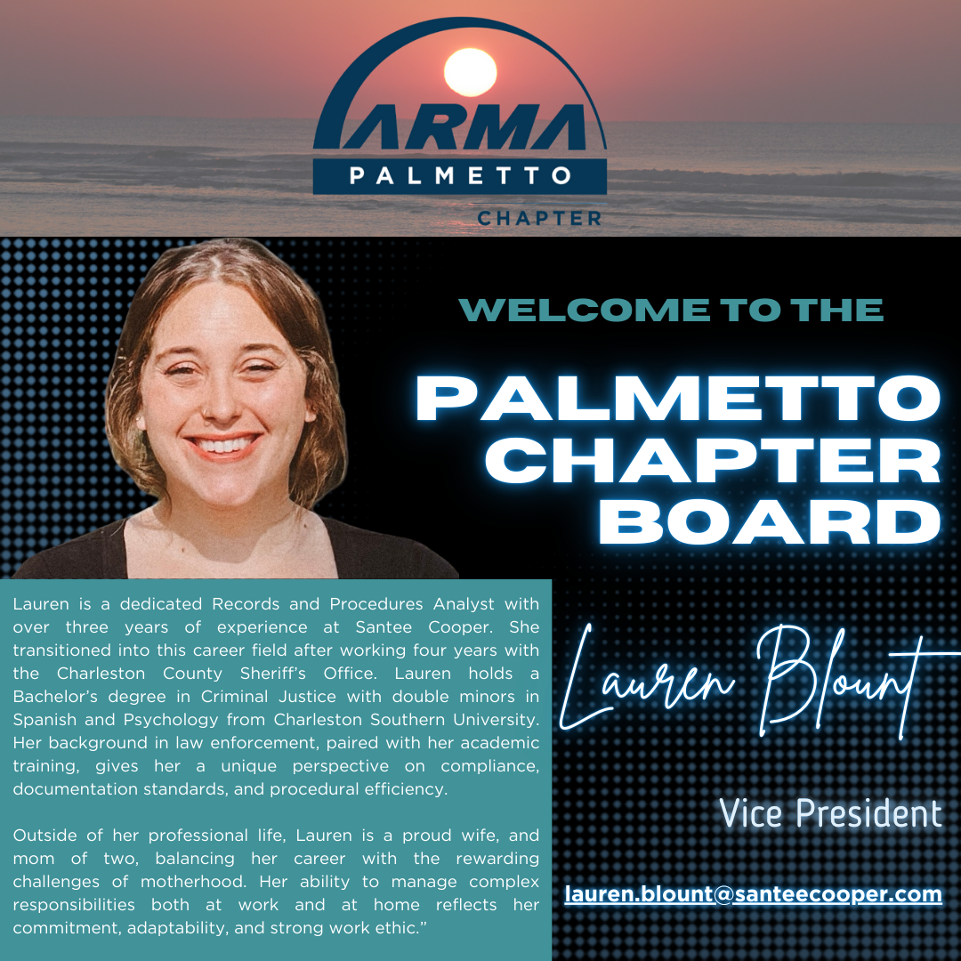 Established in 2019, the Palmetto Chapter was formed via the merging of the South Carolina's Coastal, Greenville, Central Savannah River/Aiken, and Columbia chapters enhance ARMA member's experience and elevate records/archives/information governance content that is centered around the needs of South Carolinians.